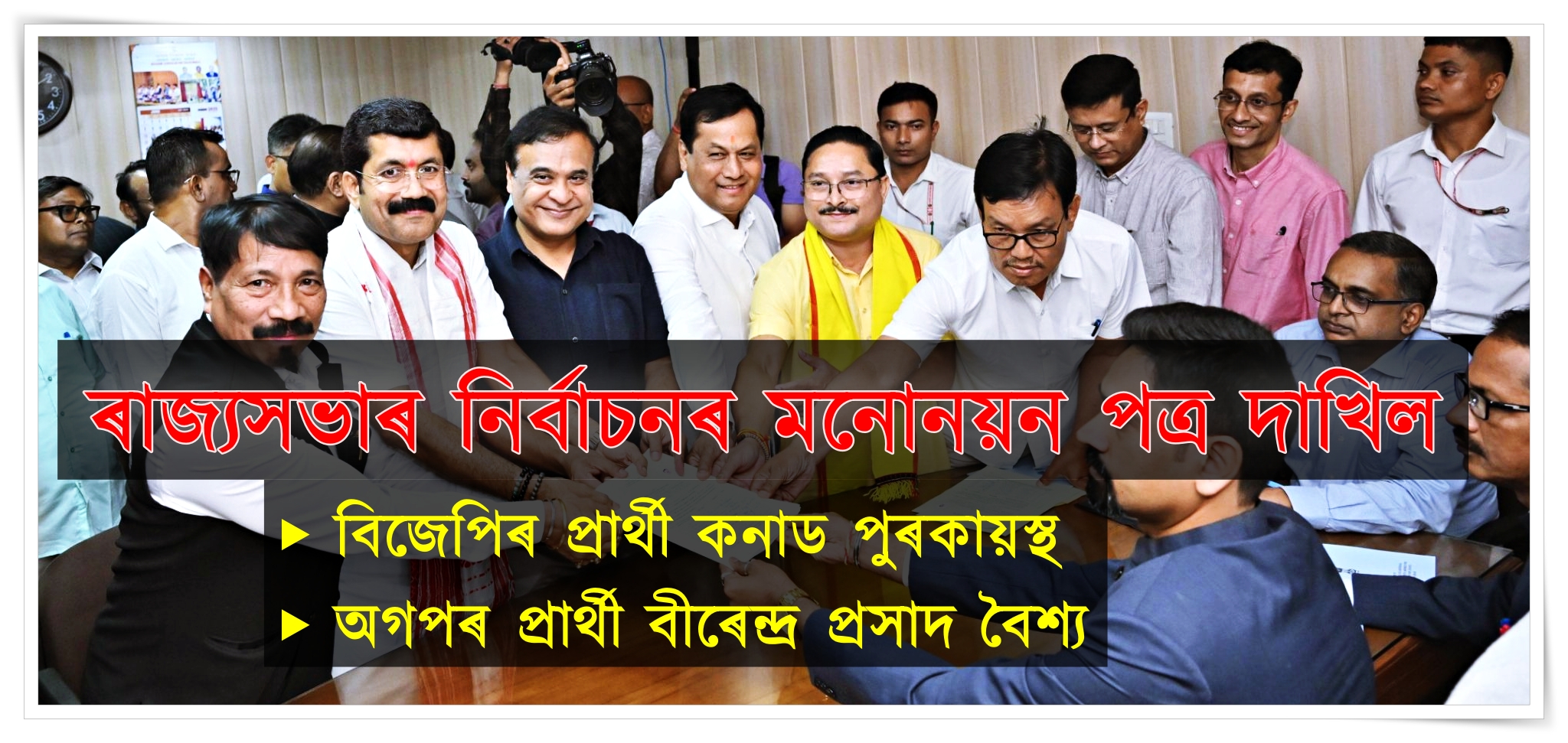 ১৯ জুনত ৰাজ্যসভাৰ নিৰ্বাচনৰ বাবে বিজেপিৰ প্ৰাৰ্থী কনাড পুৰকায়স্থ আৰু অগপৰ প্রার্থী বীৰেন্দ্ৰ প্ৰসাদ বৈশ্যই মনোনয়ন পত্র দাখিল কৰে। মনোনয়ন পত্ৰ দাখিলৰ সময়ত মুখ্যমন্ত্ৰী ড০ হিমন্ত বিশ্ব শৰ্মা, বিজেপিৰ অসম প্ৰদেশৰ সভাপতি দিলীপ শ‍ইকীয়া, অগপৰ সভাপতি অতুল বৰা, কেন্দ্ৰীয় মন্ত্ৰী সৰ্বানন্দ সোণোৱাল উপস্থিত থাকে।